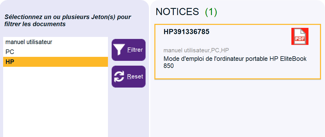 • Possibilité de filtrer les documents selon un ou plusieurs jetons