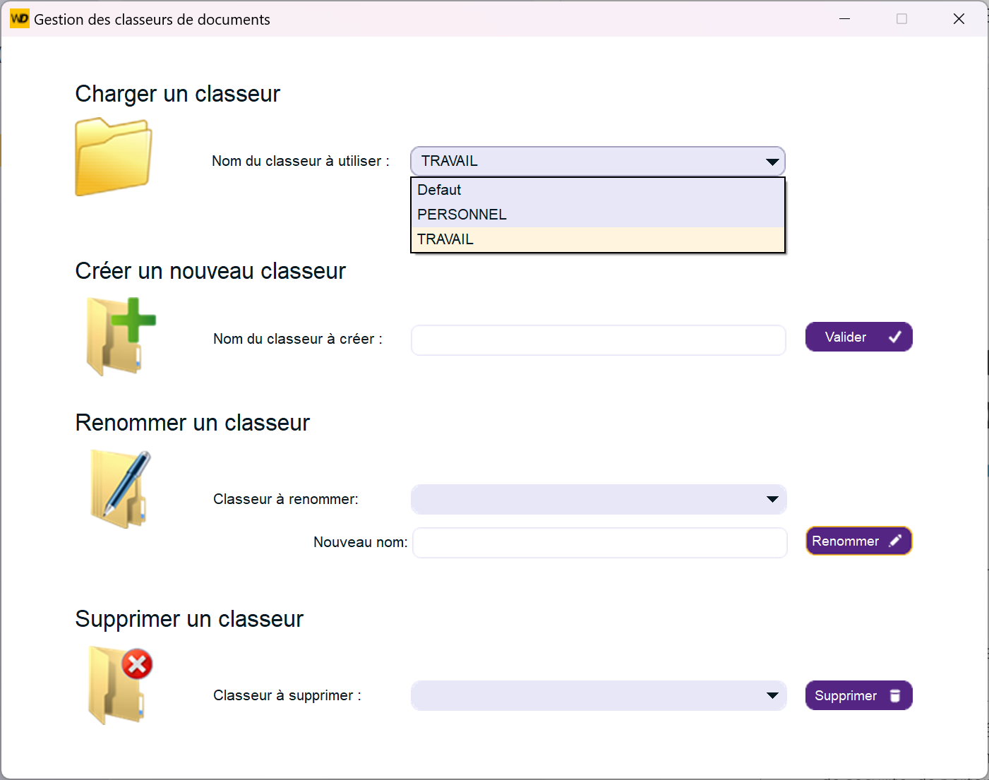 - Gestion des classeurs (ajout, suppression, renommage)